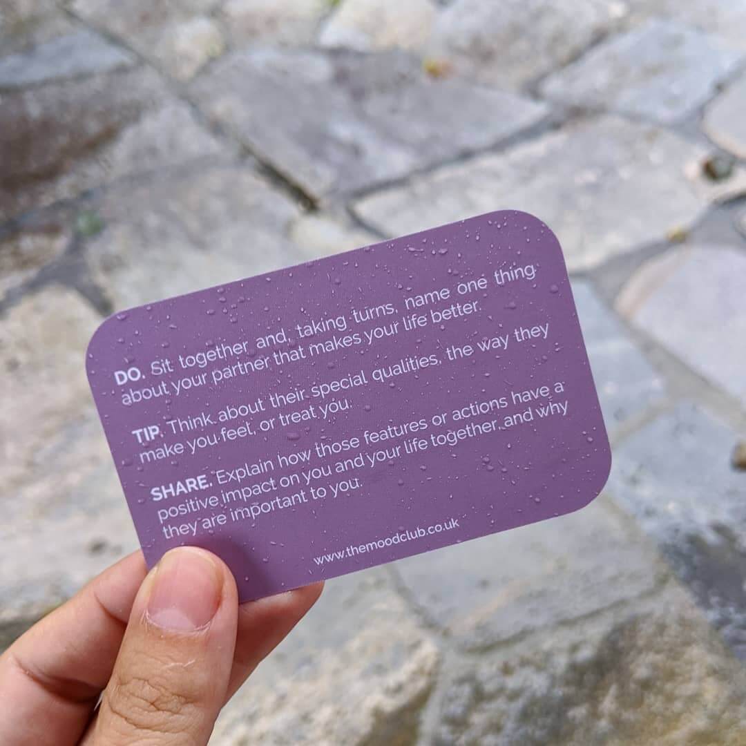 Our Mood Cards for me and you inspire you and your partner to embrace positive habits together and enhance your connection. There are 5 areas to focus on: Appreciation, Play, Support, Balance, Connection.